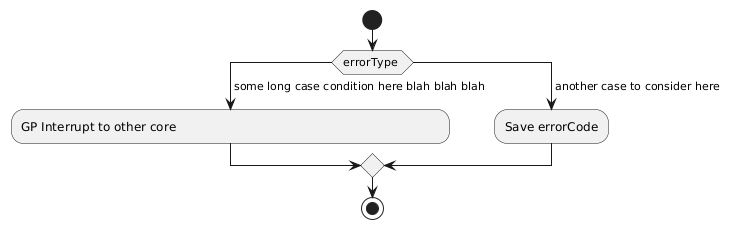 @startuml start switch (errorType ) case ( some long case condition here blah blah blah) :GP Interrupt to other core "" ""; case ( another case to consider here ) :Save errorCode; endswitch stop @enduml