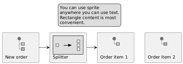@startuml !includeurl https://raw.githubusercontent.com/nikolay-martynov/eip-for-plantuml/master/dist/eip-for-plantuml.puml legend top You can use sprite anywhere you can use text. Rectangle content is most convenient. endlegend rectangle "<$EIP_MessageDouble>\nNew order" as newOrder rectangle "<$EIP_Splitter>\nSplitter" as splitter rectangle "<$EIP_MessageSingleGreen>\nOrder item 1" as item1 rectangle "<$EIP_MessageSingleOrange>\nOrder item 2" as item2 newOrder -> splitter splitter -> item1 item1 -[hidden] item2 @enduml