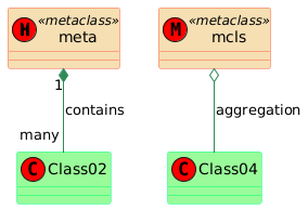 @startuml skinparam class { BackgroundColor PaleGreen ArrowColor SeaGreen BorderColor SpringGreen BackgroundColor<<metaclass>> Wheat BorderColor<<metaclass>> Tomato ArrowColor<<metaclass>> Red } skinparam stereotypeCBackgroundColor Red skinparam stereotypeCBackgroundColor<<metaclass>> DimGray skinparam spotChar Z skinparam spotChar<<metaclass>> M class meta <<metaclass>> class mcls <<metaclass>> meta "1" *-- "many" Class02 : contains mcls o-- Class04 : aggregation @enduml