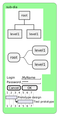 @startuml #palegreen: sub-dia {{wbs * root ** level1 ** level1 }} {{mindmap * root ** level1 ** level1 }} {{ salt { Login | "MyName " Password | "**** " [Cancel] | [ OK ] } }} {{gantt [Prototype design] lasts 3 days [Test prototype] starts at [Prototype design]'s end [Test prototype] lasts 4 days }} ; @enduml