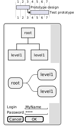 @startgantt [Prototype design] lasts 3 days [Test prototype] starts at [Prototype design]'s end [Test prototype] lasts 4 days legend {{wbs * root ** level1 ** level1 }} {{mindmap * root ** level1 ** level1 }} {{ salt { Login | "MyName " Password | "**** " [Cancel] | [ OK ] } }} end legend @endgantt