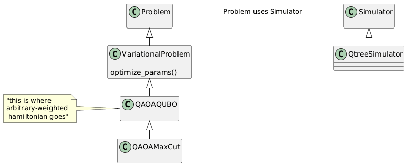 @startuml left to right direction class VariationalProblem VariationalProblem : optimize_params() Problem <|-right-- VariationalProblem VariationalProblem <|---right-- QAOAQUBO note left of QAOAQUBO "this is where arbitrary-weighted hamiltonian goes" end note QAOAQUBO <|--right-- QAOAMaxCut Problem --- Simulator: "Problem uses Simulator" Simulator <|-right-- QtreeSimulator @enduml