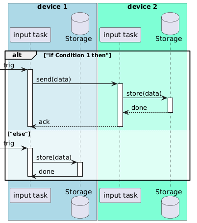 @startuml box "device 1" #LightBlue participant "input task" as p1 database "Storage" as s1 end box box "device 2" #Aquamarine participant "input task" as p2 database "Storage" as s2 end box alt #FFFFFF80 "if Condition 1 then" [-> p1 ++ : trig p1 -> p2 ++ : send(data) p2 -> s2 ++: store(data) s2 --> p2 -- : done p2 --> p1 -- : ack deactivate p1 else "else" [-> p1 ++ : trig p1 -> s1 ++ : store(data) s1 -> p1 -- : done deactivate p1 end @enduml