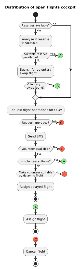 @startuml Title Distribution of open flights cockpit start if (Reserves available?) then (Yes) :Analyse if reserve\nis suitable; if (Suitable reserve\navailable?) then (Yes) #lightGreen:(A) detach else (No) :Search for voluntary\nswap flight; if (Voluntary\nswap found?) then (Yes) #lightGreen:(A) detach endif endif else (no) endif :Request flight operations for CGW; if (Request approved?) then (Yes) :Send SMS; if (Volunteer available?) then (Yes) if (Is volunteer suitable?) then (Yes) #lightGreen:(A) detach else (No) if (Make volunteer suitable\nby delaying flight) then :Assign delayed flight; stop else (No) #tomato:(C) detach endif endif else (No) #tomato:(C) detach endif else (No) #tomato:(C) detach endif #lightGreen:(A) :Assign flight; stop #tomato:(C) :Cancel flight; stop @enduml