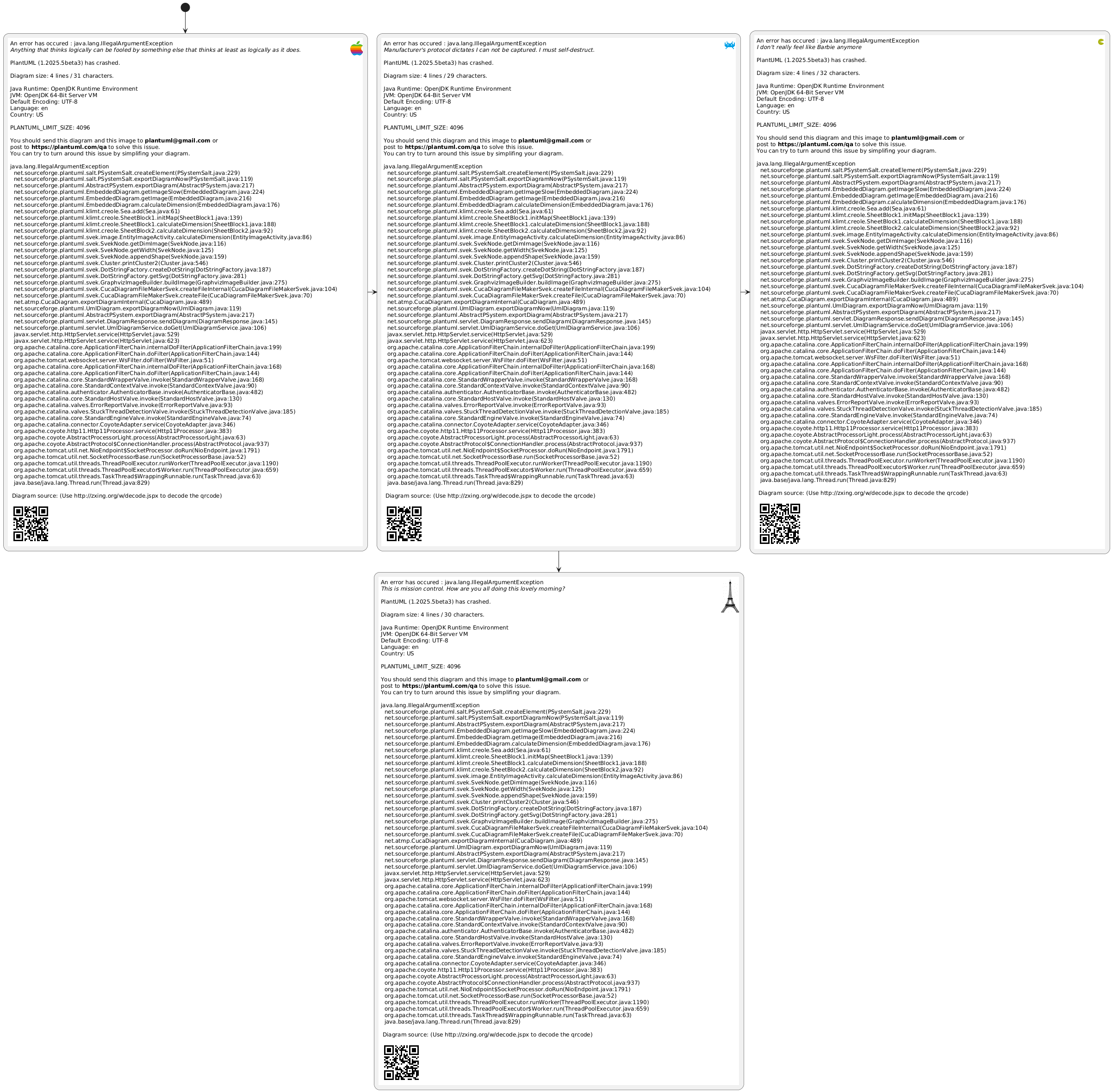 @startuml !definelong SALT(x) "{{ salt _##x }} " as x !enddefinelong !definelong _choose {+ <b>an example choose one option ()one ()two [ok] } !enddefinelong !definelong _wait {+ <b>please wait operation in progress <&clock> [cancel] } !enddefinelong !definelong _success {+ <b>success congratulations! [ok] } !enddefinelong !definelong _error {+ <b>error failed, sorry [ok] } !enddefinelong (*) --> SALT(choose) -right-> SALT(wait) wait -right-> SALT(success) wait -down-> SALT(error) @enduml