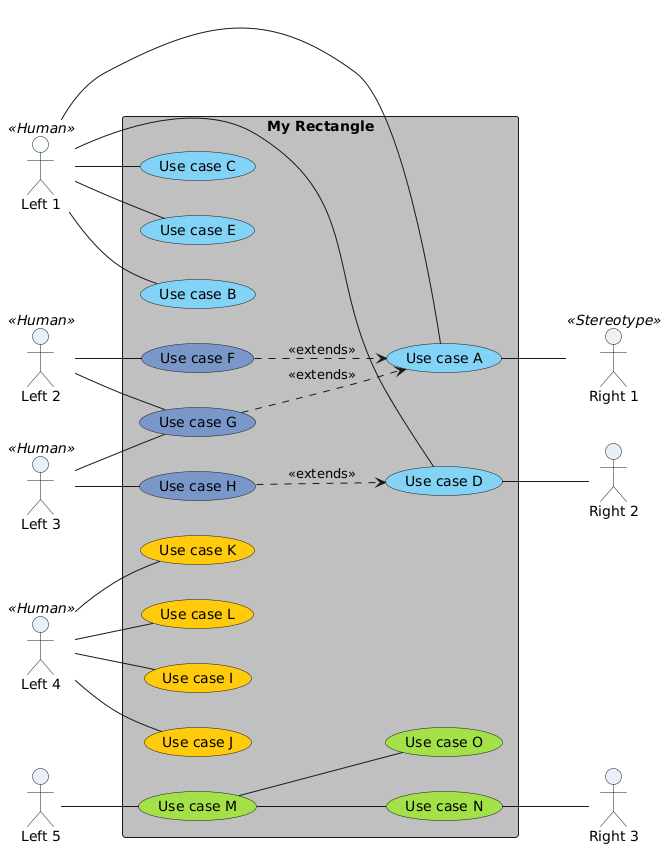 @startuml ' ======= the actors ========= actor :Left 1: as Left1 << Human >> #f8fdff actor :Right 1: as Right1 << Stereotype >> actor :Left 2: as Left2 << Human >> #eaf0f9 actor :Left 3: as Left3 << Human >> #eaf0f9 actor :Left 4: as Left4 << Human >> #eaf0f9 actor :Left 5: as Left5 #eaf0f9 actor :Right 3: as Right3 #eaf0f9 actor :Right 2: as Right2 #eaf0f9 rectangle "My Rectangle" #C0C0C0 { left to right direction ' ====== the use cases ========= (Use case A) as (UseCaseA) #83d3f6 (Use case B) as (UseCaseB) #83d3f6 (Use case C) as (UseCaseC) #83d3f6 (Use case D) as (UseCaseD) #83d3f6 (Use case E) as (UseCaseE) #83d3f6 (Use case F) as (UseCaseF) #7a97ca (Use case G) as (UseCaseG) #7a97ca (Use case H) as (UseCaseH) #7a97ca (Use case I) as (UseCaseI) #ffcb0c (Use case J) as (UseCaseJ) #ffcb0c (Use case K) as (UseCaseK) #ffcb0c (Use case L) as (UseCaseL) #ffcb0c (Use case M) as (UseCaseM) #a4e148 (Use case N) as (UseCaseN) #a4e148 (Use case O) as (UseCaseO) #a4e148 ' ====== the use case links ========= Left1 -- (UseCaseA) Left1 -- (UseCaseB) Left1 -- (UseCaseC) Left1 -- (UseCaseD) Left1 -- (UseCaseE) Left2 -- (UseCaseF) Left2 -- (UseCaseG) (UseCaseF) ..> (UseCaseA) : << extends >> (UseCaseG) ..> (UseCaseA) : << extends >> Left3 -- (UseCaseG) Left3 -- (UseCaseH) (UseCaseH) ..> (UseCaseD) : << extends >> Left4 -- (UseCaseI) Left4 -- (UseCaseJ) Left4 -- (UseCaseK) Left4 -- (UseCaseL) Left5 -- (UseCaseM) (UseCaseM) -- (UseCaseN) (UseCaseM) -- (UseCaseO) Right3 -up- (UseCaseN) 'TODO: These last 2 should be positioned on the right hand side. How to do it? 'Right1 -- (UseCaseA) 'Right2 -- (UseCaseD) 'These do not work. PlantUML will put the Actors far away at the bottom (UseCaseA) -- Right1 (UseCaseD) -- Right2 } @enduml