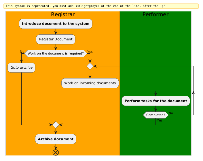 @startuml skinparam rectangleBorderThickness 1 |#orange|Registrar| #lightgray:**Introduce document to the system**; :Register Document; if (Work on the document is required?) then (No) ://Goto archive//; '#lightgray:**Archive document**; 'end else (Yes) repeat :Work on incoming documents; |#green|Performer| :**Perform tasks for the document**; repeat while (Completed?) is (No) not (Yes) |#orange|Registrar| '#lightgray:**Archive document**; endif #lightgray:**Archive document**; end @enduml