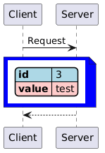 @startuml <style> note { BackgroundColor blue } ' Has no effect: node { BackGroundColor blue } highlight { BackGroundColor red } ' Has no effect: jsonDiagram { node { BackGroundColor blue } highlight { BackGroundColor red } } </style> Client -> Server : Request note over Client, Server {{json <style> ' Has an effect: node { BackGroundColor lightblue } highlight { BackGroundColor #ffcccb } </style> #highlight "value" { "id": 3, "value": "test" } }} end note return @enduml