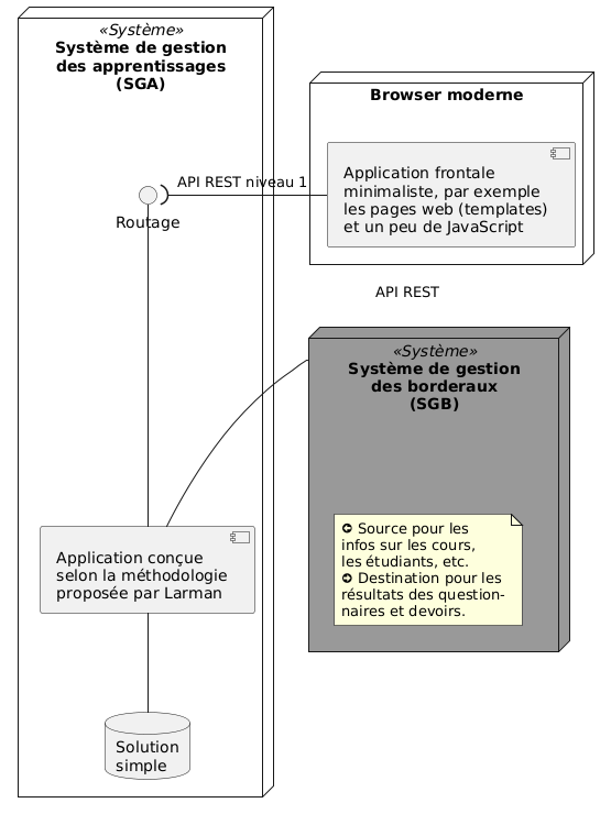 @startuml skinparam style strictuml skinparam componentStyle uml2 node "Browser moderne" { component [Application frontale\nminimaliste, par exemple\nles pages web (templates)\net un peu de JavaScript] as GUI } node "Système de gestion\ndes apprentissages\n(SGA)" <<Système>> { interface Routage as Router [Application conçue\nselon la méthodologie\nproposée par Larman] as App database "Solution\nsimple" as SimpleDB { } } node "Système de gestion\ndes borderaux\n(SGB)" as SGB <<Système>> #999999 { note as SGBNote <&arrow-circle-left> Source pour les infos sur les cours, les étudiants, etc. <&arrow-circle-right> Destination pour les résultats des question- naires et devoirs. end note } GUI -left-( Router : API REST niveau 1 Router -down- App App -down- SimpleDB App -right- SGB : API REST @enduml