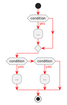 @startuml start skinparam Arrow { Color Red FontColor Red } '!pragma useVerticalIf on if (condition) then (yes) :...; endif if (condition) then (yes) :...; elseif (condition) then (yes) :...; endif stop @enduml