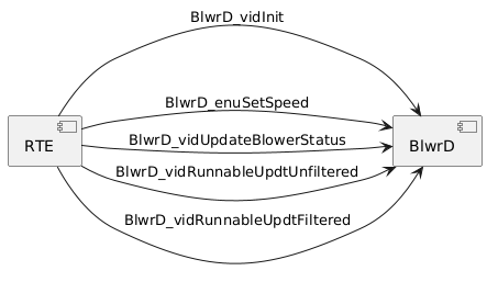 @startuml left to right direction ''skinparam linetype ortho skinparam componentstyle uml2 component [RTE] as rte component [BlwrD] as blwr rte --> blwr : BlwrD_vidInit rte --> blwr : BlwrD_enuSetSpeed rte --> blwr : BlwrD_vidUpdateBlowerStatus rte --> blwr : BlwrD_vidRunnableUpdtUnfiltered rte --> blwr : BlwrD_vidRunnableUpdtFiltered @enduml