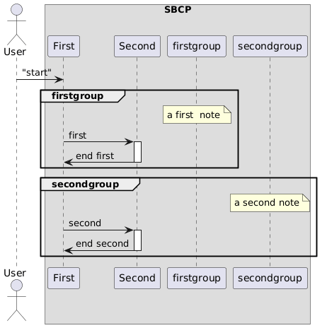 @startuml actor User as U box SBCP participant "First" as F participant "Second" as S U -> F : "start" group firstgroup note over firstgroup a first note end note F -> S ++ : first S -> F -- : end first end group group secondgroup note over secondgroup a second note end note F -> S ++ : second S -> F -- : end second end group @enduml