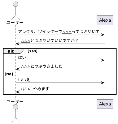 @startuml actor ユーザー as user participant Alexa as alexa user -> alexa : アレクサ、ツイッターで△△△ってつぶやいて alexa -> user : △△△とつぶやいていいですか? alt Yes user -> alexa : はい alexa -> user : △△△とつぶやきました else No user -> alexa : いいえ alexa -> user : はい、やめます end @enduml