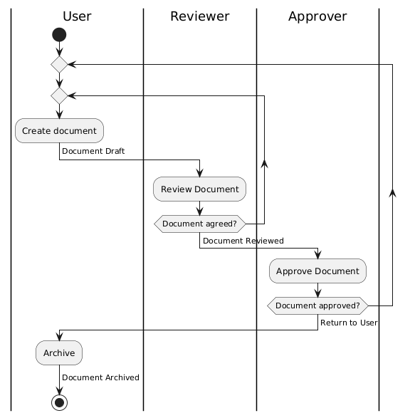 @startuml 'skinparam conditionStyle diamond |User| Start repeat repeat :Create document; ->Document Draft; |Reviewer| :Review Document; repeat while (Document agreed?) ->Document Reviewed; |Approver| :Approve Document; repeat while (Document approved?) ->Return to User; |User| :Archive; ->Document Archived; stop @enduml