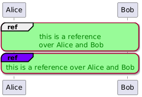 @startuml <style> sequenceDiagram { reference { RoundCorner 20 FontName SansSerif HyperLinkColor blue FontColor green FontSize 14 FontStyle plain HorizontalAlignment center DiagonalCorner 5 LineThickness 2 LineColor #A80036 BackGroundColor palegreen Shadowing 1 } } </style> ref over Alice, Bob : this is a reference\n over Alice and Bob ref#7700FF over Alice, Bob : this is a reference over Alice and Bob @enduml