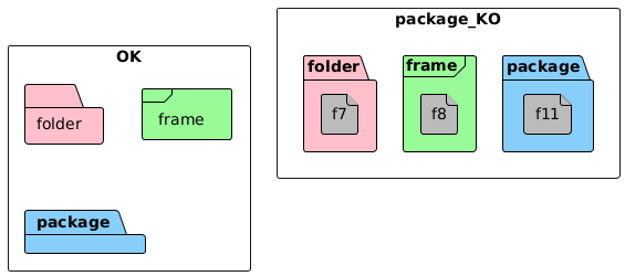 @startuml <style> file { BackGroundColor #b LineThickness 1 LineColor black } folder { BackGroundColor #pink LineThickness 1 LineColor black } frame { BackGroundColor #palegreen LineThickness 1 LineColor black } package { BackGroundColor #LightSkyBlue LineThickness 1 LineColor black } </style> rectangle OK { folder folder frame frame package package } rectangle package_KO { folder e7 as "folder" { file f7 } frame e8 as "frame" { file f8 } package e11 as "package" { file f11 } } @enduml