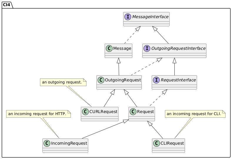 @startuml package "CI4" { interface MessageInterface interface OutgoingRequestInterface extends MessageInterface interface RequestInterface extends OutgoingRequestInterface class Message implements MessageInterface class OutgoingRequest extends Message implements OutgoingRequestInterface class Request extends OutgoingRequest implements RequestInterface class IncomingRequest extends Request note top of IncomingRequest an incoming request for HTTP. end note class CLIRequest extends Request note top of CLIRequest an incoming request for CLI. end note class CURLRequest extends OutgoingRequest note top of CURLRequest an outgoing request. end note } @enduml