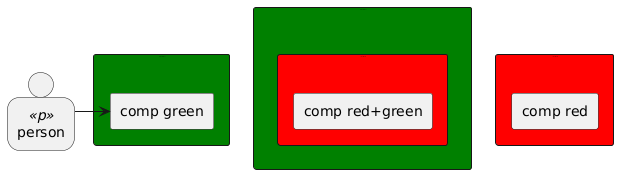 @startuml skinparam Rectanglebackgroundcolor<<zoneRed>> red skinparam RectangleFontSize<<zoneRed>> 1 skinparam RectangleStereotypeFontSize<<zoneRed>> 1 skinparam Rectanglebackgroundcolor<<zoneGreen>> green skinparam RectangleFontSize<<zoneGreen>> 1 skinparam RectangleStereotypeFontSize<<zoneGreen>> 1 person "person" <<p>> rectangle " " as zg2 <<zoneGreen>> { rectangle "comp green" as cg } rectangle " " as zg1 <<zoneGreen>> { rectangle " " as zr1 <<zoneRed>> { rectangle "comp red+green" as crg } } rectangle " " as zr2 <<zoneRed>> { rectangle "comp red" as cr } person -> cg @enduml