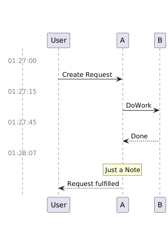 @startuml !pragma teoz true skinparam Shadowing false skinparam sequence { ActorBorderColor white ActorBackgroundColor transparent ActorFontColor white LifeLineBorderColor<<time>> white } skinparam note { BackgroundColor<<timer>> transparent BorderColor<<timer>> transparent FontColor<<timer>> gray } actor time_actor << time >> rnote<<timer>> over time_actor: 01:27:00 User -> A: Create Request rnote<<timer>> over time_actor: 01:27:15 A -> B: DoWork rnote<<timer>> over time_actor: 01:27:45 B --> A: Done rnote<<timer>> over time_actor: 01:28:07 rnote over A: Just a Note A --> User: Request fulfilled @enduml