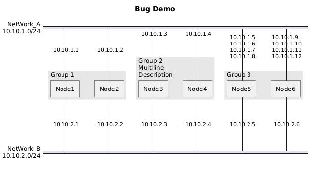 @startuml title Bug Demo nwdiag { group Group_1 { description = "Group 1"; Node1; Node2; } group Group_2 { description = "Group 2\nMultiline\nDescription"; Node3; Node4; } group Group_3 { description = "Group 3"; Node5; Node6; } network NetWork_A { address = "10.10.1.0/24"; Node1 [ address = "10.10.1.1" ]; Node2 [ address = "10.10.1.2" ]; Node3 [ address = "10.10.1.3\n\n\n" ]; Node4 [ address = "10.10.1.4\n\n\n" ]; Node5 [ address = "10.10.1.5, 10.10.1.6, 10.10.1.7, 10.10.1.8\n" ]; Node6 [ address = "10.10.1.9, 10.10.1.10, 10.10.1.11, 10.10.1.12\n" ]; } network NetWork_B { address = "10.10.2.0/24"; Node1 [ address = "10.10.2.1" ]; Node2 [ address = "10.10.2.2" ]; Node3 [ address = "10.10.2.3" ]; Node4 [ address = "10.10.2.4" ]; Node5 [ address = "10.10.2.5" ]; Node6 [ address = "10.10.2.6" ]; } } @enduml