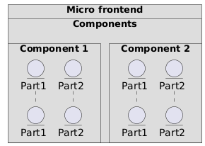 @startuml !pragma teoz true box "Micro frontend" ' add \n <--------------------- box "Components\n" box "Component 1" entity Part1 as C1P1 entity Part2 as C1P2 end box box "Component 2" entity Part1 as C2P1 entity Part2 as C2P2 end box end box end box @enduml