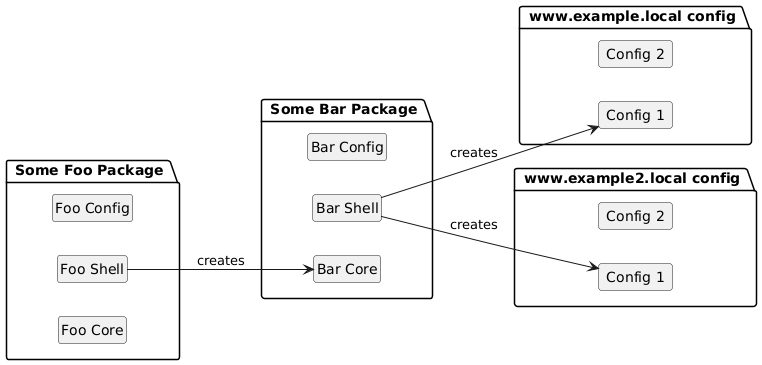 @startuml left to right direction hide circle hide members package " Some Foo Package " as P1 { class "Foo Core" as FooCore class "Foo Shell" as FooShell class "Foo Config" as FooConfig } package " Some Bar Package " as P2 { class "Bar Core" as BarCore class "Bar Shell" as BarShell class "Bar Config" as BarConfig } package " www.example.local config " as P3 { class " Config 1 " as Config11 class " Config 2 " as Config12 } package " www.example2.local config " as P4 { class " Config 1 " as Config21 class " Config 2 " as Config22 } FooShell --> BarCore: creates BarShell --> Config11: creates BarShell --> Config21: creates @enduml