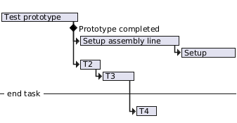 @startgantt <style> ganttDiagram { timeline { LineColor transparent FontColor transparent } } </style> hide footbox [Test prototype] lasts 7 days [Prototype completed] happens at [Test prototype]'s end [Setup assembly line] lasts 9 days [Setup assembly line] starts at [Test prototype]'s end then [Setup] lasts 5 days [T2] lasts 2 days and starts at [Test prototype]'s end then [T3] lasts 3 days -- end task -- then [T4] lasts 2 days @endgantt