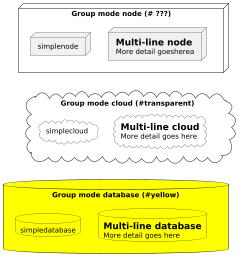 @startuml !procedure $g() scale 0.5 node "Group mode node (# ???)" as n { node simplenode node multilinenode[ = Multi-line node More detail goesherea ] } cloud "Group mode cloud (#transparent)" as c { cloud simplecloud cloud multilinecloud[ = Multi-line cloud More detail goes here ] } database "Group mode database (#yellow)" as d { database simpledatabase database multilinedatabase[ = Multi-line database More detail goes here ] } n-[hidden]->c c-[hidden]->d !endprocedure skinparam backgroundColor transparent skinparam cloudBackgroundColor transparent skinparam databaseBackgroundColor yellow $g() @enduml