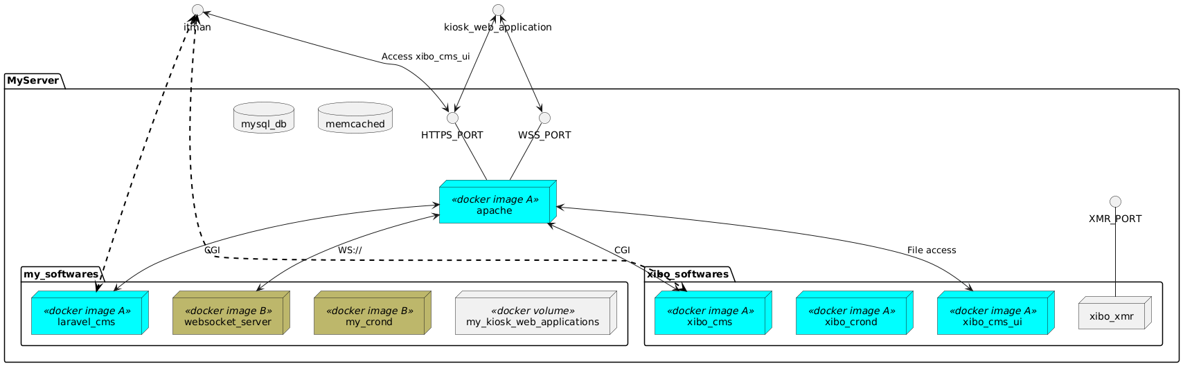 @startuml skinparam node { BackgroundColor<<docker image A>> Aqua BackgroundColor<<docker image B>> DarkKhaki } package MyServer { package xibo_softwares { node xibo_cms <<docker image A>> node xibo_crond <<docker image A>> node xibo_cms_ui <<docker image A>> node xibo_xmr } package my_softwares { node laravel_cms <<docker image A>> node websocket_server <<docker image B>> node my_crond <<docker image B>> node my_kiosk_web_applications <<docker volume>> } node apache <<docker image A>> database mysql_db database memcached HTTPS_PORT -- apache WSS_PORT -- apache XMR_PORT -- xibo_xmr } apache <--> xibo_cms : CGI apache <--> laravel_cms : CGI apache <--> websocket_server : WS:// apache <--> xibo_cms_ui : File access itman <--> HTTPS_PORT : Access xibo_cms_ui itman <.[#Black,thickness=2].> xibo_cms itman <.[#Black,thickness=2].> laravel_cms kiosk_web_application <--> WSS_PORT kiosk_web_application <--> HTTPS_PORT @enduml
