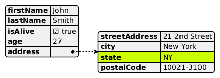 @startjson <style> jsonDiagram { node { BackGroundColor Khaki LineColor lightblue FontName Helvetica FontColor red FontSize 18 FontStyle bold RoundCorner 0 LineThickness 2 LineStyle 10;5 separator { LineThickness 0.5 LineColor black LineStyle 1;5 } } arrow { BackGroundColor lightblue LineColor green LineThickness 2 LineStyle 2;5 } } </style> #highlight "address" / "state" { "firstName": "John", "lastName": "Smith", "isAlive": true, "age": 27, "address": { "streetAddress": "21 2nd Street", "city": "New York", "state": "NY", "postalCode": "10021-3100" } } @endjson