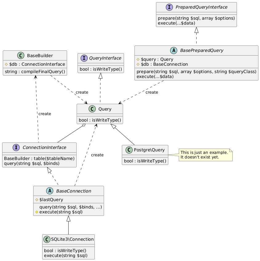 @startuml interface ConnectionInterface { BaseBuilder : table($tableName) query(string $sql, $binds) } abstract class BaseConnection implements ConnectionInterface { #$lastQuery query(string $sql, $binds, ...) #execute(string $sql) } BaseConnection ..> Query : create class SQLite3\Connection extends BaseConnection { bool : isWriteType() execute(string $sql) } interface QueryInterface { bool : isWriteType() } class Query implements QueryInterface { bool : isWriteType() } Query o-- ConnectionInterface class Postgre\Query extends Query { bool : isWriteType() } note right of Postgre\Query : This is just an example.\nIt doesn't exist yet. class BaseBuilder { #$db : ConnectionInterface string : compileFinalQuery() } BaseBuilder <.. ConnectionInterface : create BaseBuilder ..> Query : create interface PreparedQueryInterface { prepare(string $sql, array $options) execute(...$data) } abstract class BasePreparedQuery implements PreparedQueryInterface { #$query : Query #$db : BaseConnection prepare(string $sql, array $options, string $queryClass) execute(...$data) } BasePreparedQuery ..> Query : create @enduml