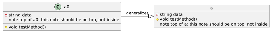 @startuml class a0 { -string data #void testMethod() note top of a0: this note should be on top, not inside } object a { -string data #void testMethod() note top of a: this note should be on top, not inside } a0-|>a:generalizes @enduml
