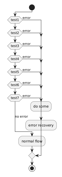 @startuml !pragma useverticalif on start if (test1) then (error) label error elseif (test2) then (error) goto error elseif (test3) then (error) goto error elseif (test4) then (error) goto error elseif (test5) then (error) goto error elseif (test6) then (error) goto error elseif (test7) then (error) :do some; :error recovery; detach else (no error) :normal flow; endif stop @enduml