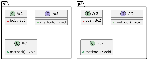 @startuml package p1 { class Ac1 { - bc1 : Bc1 } interface Ai1 { + method() : void } class Bc1 { + method() : void } } package p2 { class Ac2 { - bc2 : Bc2 } interface Ai2 { + method() : void } class Bc2 { + method() : void } } 'p1 -[hidden]- p2 @enduml