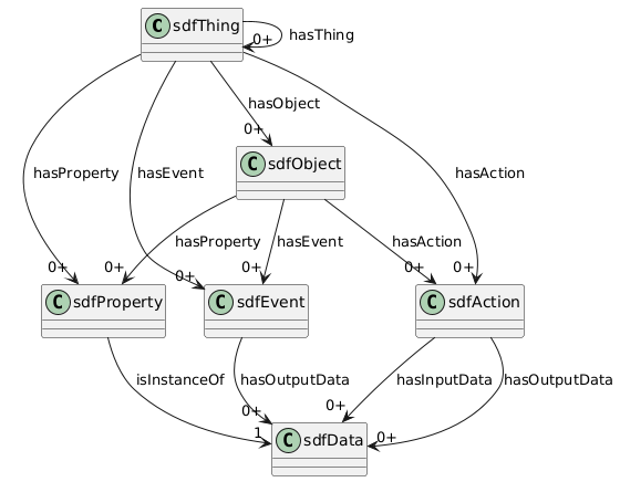 @startuml sdfThing --> "0+" sdfObject : hasObject sdfThing --> "0+" sdfThing : hasThing sdfThing --> "0+" sdfProperty : hasProperty sdfThing --> "0+" sdfAction : hasAction sdfThing --> "0+" sdfEvent : hasEvent sdfObject --> "0+" sdfProperty : hasProperty sdfObject --> "0+" sdfAction : hasAction sdfObject --> "0+" sdfEvent : hasEvent sdfAction --> "0+" sdfData : hasInputData sdfAction --> "0+" sdfData : hasOutputData sdfEvent --> "0+" sdfData : hasOutputData sdfProperty --> "1" sdfData : isInstanceOf class sdfThing { } class sdfObject { } class sdfProperty { } class sdfAction { } class sdfEvent { } class sdfData { } @enduml