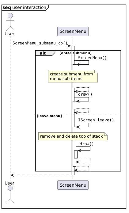 @startuml autoactivate on mainframe **seq** user interaction actor User User -> ScreenMenu : ""ScreenMenu_submenu_cb()"" alt enter submenu ScreenMenu -> ScreenMenu : ""ScreenMenu()"" note over ScreenMenu create submenu from menu sub-items end note return ScreenMenu -> ScreenMenu : ""draw()"" return else leave menu ScreenMenu -> ScreenMenu : ""IScreen_leave()"" note over ScreenMenu remove and delete top of stack end note ScreenMenu -> ScreenMenu : ""draw()"" return return end return @enduml