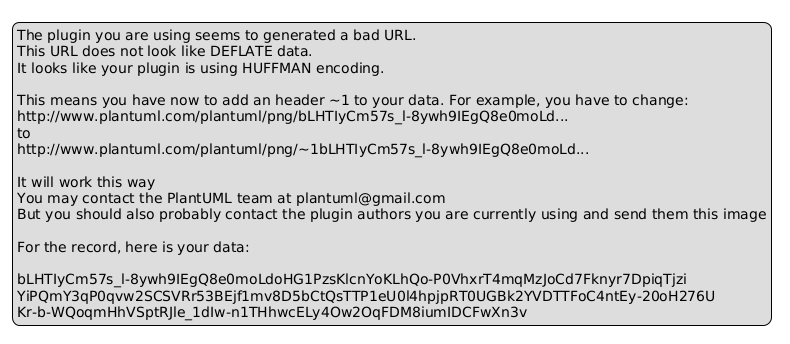 @startuml legend The plugin you are using seems to generated a bad URL. This URL does not look like DEFLATE data. It looks like your plugin is using HUFFMAN encoding. This means you have now to add an header ~1 to your data. For example, you have to change: http://www.plantuml.com/plantuml/png/bLHTIyCm57s_l-8ywh9IEgQ8e0moLd... to http://www.plantuml.com/plantuml/png/~1bLHTIyCm57s_l-8ywh9IEgQ8e0moLd... It will work this way You may contact the PlantUML team at plantuml@gmail.com But you should also probably contact the plugin authors you are currently using and send them this image For the record, here is your data: bLHTIyCm57s_l-8ywh9IEgQ8e0moLdoHG1PzsKlcnYoKLhQo-P0VhxrT4mqMzJoCd7Fknyr7DpiqTjzi YiPQmY3qP0qvw2SCSVRr53BEjf1mv8D5bCtQsTTP1eU0l4hpjpRT0UGBk2YVDTTFoC4ntEy-20oH276U Kr-b-WQoqmHhVSptRJle_1dIw-n1THhwcELy4Ow2OqFDM8iumIDCFwXn3v endlegend @enduml