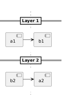 @startuml skinparam style strictuml skinparam shadowing false skinparam note { BackgroundColor white BorderColor white } skinparam participant { BackgroundColor white BorderColor white } hide unlinked participant " " as dummy ==Layer 1== note over dummy {{ component a1 as a1 { } component b1 as b1 { } a1->b1 }} end note ==Layer 2== note over dummy {{ component a2 as a2 { } component b2 as b2 { } b2->a2 }} end note @enduml