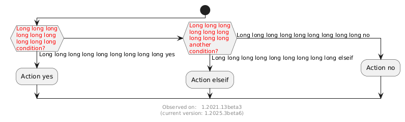 @startuml <style> activityDiagram { MaximumWidth 100 diamond { FontColor red MaximumWidth 100 } } </style> start if (Long long long long long long long long long condition?) then (Long long long long long long long long long yes) :Action yes; elseif (Long long long long long long long long long another condition?) ->Long long long long long long long long long elseif; :Action elseif; else (Long long long long long long long long long no) :Action no; endif footer \nObserved on: 1.2021.13beta3\n(current version: %version()) @enduml
