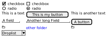 @startsalt { [X] checkbox|[] checkbox () radio | (X) radio This is a text|[This is my button]|This is another text "A field"|"Another long Field"|[A button] <<folder ............ .XXXXX...... .X...X...... .XXXXXXXXXX. .X........X. .X........X. .X........X. .X........X. .XXXXXXXXXX. ............ >>|<color:blue>other folder|<<folder>> ^Droplist^ } @endsalt