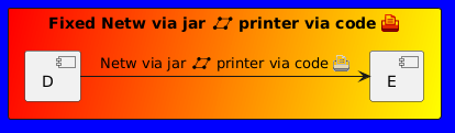 @startuml sprite Netw jar:archimate/network sprite $printer [15x15/8z] NOtH3W0W208HxFz_kMAhj7lHWpa1XC716sz0Pq4MVPEWfBHIuxP3L6kbTcizR8tAhzaqFvXwvFfPEqm0 skinparam backgroundcolor blue skinparam rectanglebackgroundcolor red/yellow rectangle "Fixed Netw via jar <$Netw> printer via code <$printer>" as netw { [D] -> [E]: "Netw via jar <$Netw> printer via code <$printer>" } @enduml