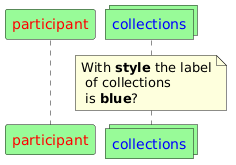 @startuml <style> participant { BackGroundColor palegreen FontColor red } collections { BackGroundColor palegreen FontColor blue } </style> participant participant collections collections note over collections: With **style** the label\n of collections\n is **blue**? @enduml