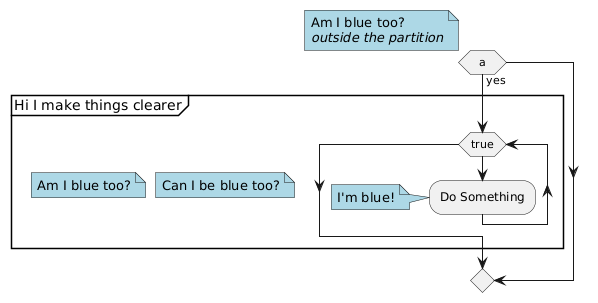 @startuml if (a) then (yes) partition "Hi I make things clearer" { note #lightblue Am I blue too? end note while (true) note #lightblue Can I be blue too? end note :Do Something; note #lightblue I'm blue! end note end while } endif note #lightblue Am I blue too? //outside the partition// end note @enduml