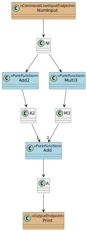 @startuml skinparam class { BackgroundColor<<CommandLineInputEndpoint>> BurlyWood BackgroundColor<<CommandLineArgsInputEndpoint>> BurlyWood BackgroundColor<<AliyunHttpInputEndpoint>> BurlyWood BackgroundColor<<OutputEndpoint>> BurlyWood BackgroundColor<<PureFunction>> LightBlue BackgroundColor<<AlternativePath>> Crimson } class NumInput <<CommandLineInputEndpoint>> class Add2 <<PureFunction>> class Add <<PureFunction>> class Print <<OutputEndpoint>> class Multi3 <<PureFunction>> NumInput --> NI::Integer NI::Integer --> Add2 NI::Integer --> Multi3 Add2 --> A2::Integer A2::Integer --> "1" Add Multi3 --> M3::Integer M3::Integer --> "2" Add Add --> A::Integer A::Integer --> Print @enduml