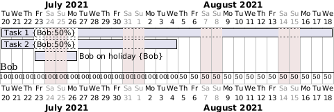 @startgantt project starts 2021-07-20 Saturdays are closed Sundays are closed [Task 1] on {Bob:50%} starts 2021-07-20 and lasts 10 days [Task 2] on {Bob:50%} starts 2021-07-20 and lasts 5 days [Bob on holiday] on {Bob:100%} Starts 2021-07-23 and ends 2021-07-26 [Task 1] pauses on 2021-07-23 to 2021-07-26 [Task 2] pauses on 2021-07-23 to 2021-07-26 @endgantt