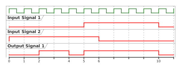 @startuml <style> timingDiagram { binary { LineColor green } } </style> clock clk with period 1 binary "Input Signal 1" as IS1 binary "Input Signal 2" as IS2 binary "Output Signal 1" as OS1 @0 IS1 is low IS2 is high @5 IS1 is high @6 IS2 is low @10 IS1 is low /' Output Signals '/ <style> timingDiagram { binary { LineColor red } } </style> @0 OS1 is low @2 OS1 is high @4 OS1 is low @5 OS1 is high @10 OS1 is low @enduml