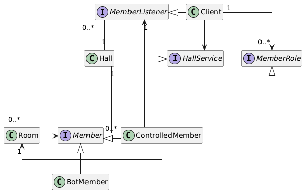 @startuml ''hide circle hide empty members hide empty attributes skinparam linetype ortho skinparam shadowing false 'skinparam MinClassWidth 70 'skinparam nodesep 80 'skinparam ranksep 80 interface MemberListener interface MemberRole interface HallService interface Member '' relations '' Client --> HallService MemberListener <|- Client Client "1" -> "0..*" MemberRole HallService <|- Hall MemberListener "0..*" - "1" Hall Hall --- "0..*" Room Hall "1" - "0..*" ControlledMember MemberListener "1" <--- ControlledMember MemberRole <|--- ControlledMember Member <|- ControlledMember Room "1" <- ControlledMember Room -> Member Member <|-- BotMember @enduml