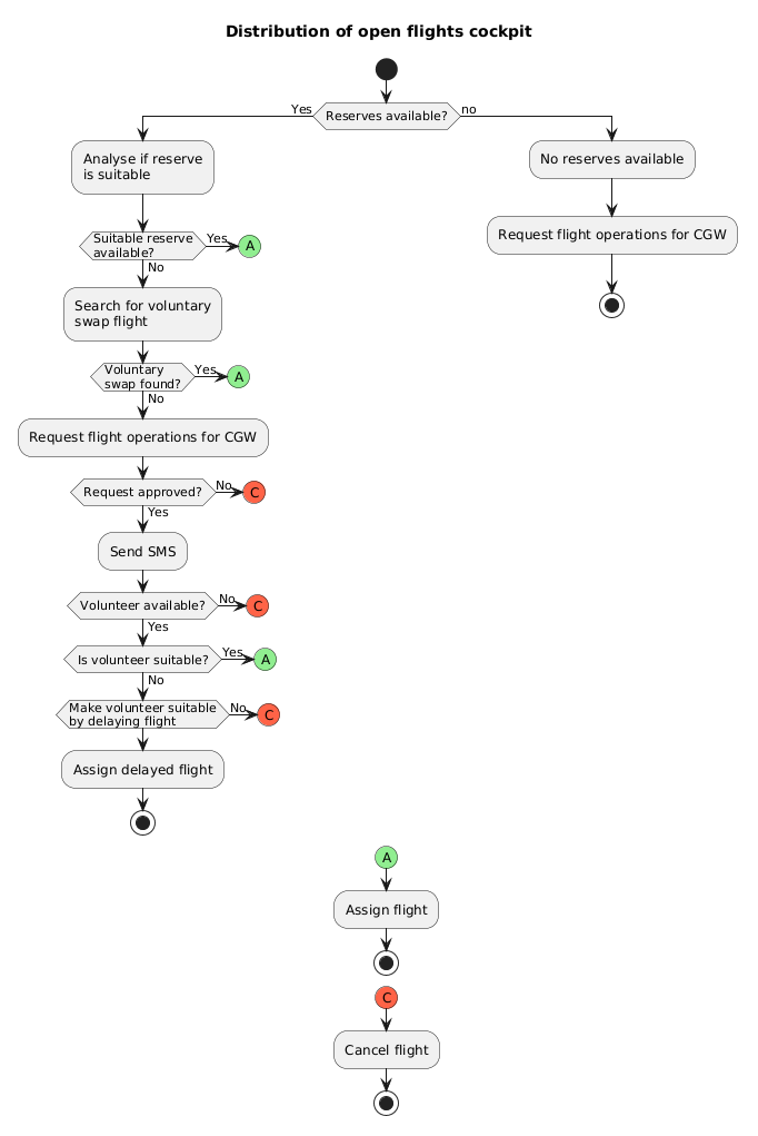 @startuml Title Distribution of open flights cockpit start if (Reserves available?) then (Yes) :Analyse if reserve\nis suitable; if (Suitable reserve\navailable?) then (Yes) #lightGreen:(A) detach else (No) :Search for voluntary\nswap flight; if (Voluntary\nswap found?) then (Yes) #lightGreen:(A) detach else (No) :Request flight operations for CGW; if (Request approved?) then (Yes) :Send SMS; if (Volunteer available?) then (Yes) if (Is volunteer suitable?) then (Yes) #lightGreen:(A) detach else (No) if (Make volunteer suitable\nby delaying flight) then :Assign delayed flight; stop else (No) #tomato:(C) detach endif endif else (No) #tomato:(C) detach endif else (No) #tomato:(C) detach endif endif endif else (no) :No reserves available; :Request flight operations for CGW; stop endif #lightGreen:(A) :Assign flight; stop #tomato:(C) :Cancel flight; stop @enduml