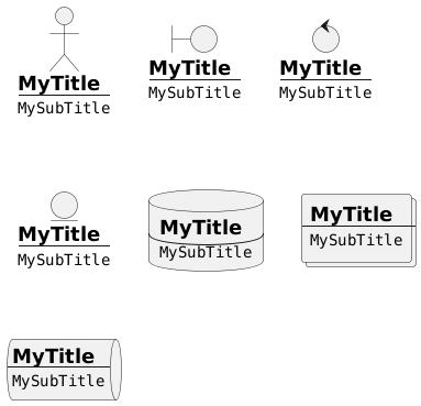 @startuml actor a1 [ =MyTitle ---- ""MySubTitle"" ] boundary b1 [ =MyTitle ---- ""MySubTitle"" ] control c1 [ =MyTitle ---- ""MySubTitle"" ] entity e1 [ =MyTitle ---- ""MySubTitle"" ] database d1 [ =MyTitle ---- ""MySubTitle"" ] collections c2 [ =MyTitle ---- ""MySubTitle"" ] queue q1 [ =MyTitle ---- ""MySubTitle"" ] @enduml