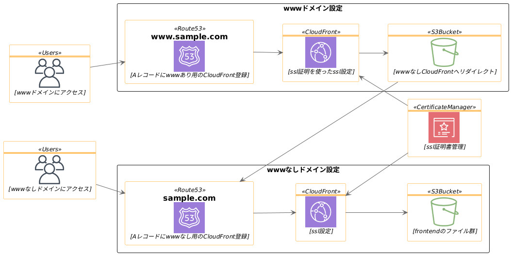 @startuml !define AWSPuml https://raw.githubusercontent.com/awslabs/aws-icons-for-plantuml/master/dist !include AWSPuml/AWSCommon.puml !include AWSPuml/NetworkingAndContentDelivery/Route53.puml !include AWSPuml/NetworkingAndContentDelivery/CloudFront.puml !include AWSPuml/Storage/S3Bucket.puml !include AWSPuml/Compute/EC2.puml !include AWSPuml/General/Users.puml !include AWSPuml/SecurityIdentityAndCompliance/CertificateManager.puml left to right direction Users(user, "", "wwwなしドメインにアクセス") Users(user_www, "", "wwwドメインにアクセス") CertificateManager(certificate, "", "ssl証明書管理") Rectangle wwwドメイン設定 { Route53(route_www, "www.sample.com", "Aレコードにwwwあり用のCloudFront登録") CloudFront(cloud_www, "", "ssl証明を使ったssl設定") S3Bucket(s3_www, "", "wwwなしCloudFrontへリダイレクト") } Rectangle wwwなしドメイン設定 { Route53(route, "sample.com", "Aレコードにwwwなし用のCloudFront登録") CloudFront(cloud, "", "ssl設定") S3Bucket(s3, "", "frontendのファイル群") } user_www --> route_www route_www --> cloud_www cloud_www <-- certificate cloud_www --> s3_www user --> route route --> cloud certificate --> cloud cloud --> s3 user -[hidden]le- user_www s3_www -le-> route route_www -[hidden]le- route @enduml